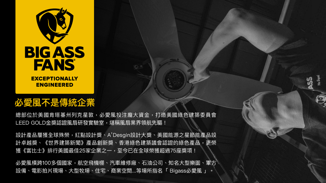 美國Bigass必愛風是世界領導風扇品牌,在美國已創立20多年,將吊扇導入航空技術,高效電機與美學完美融合!家用吊扇更連續數年榮獲國際各大設計獎、多國知名綠能認證!堪稱精品吊扇世紀模範。