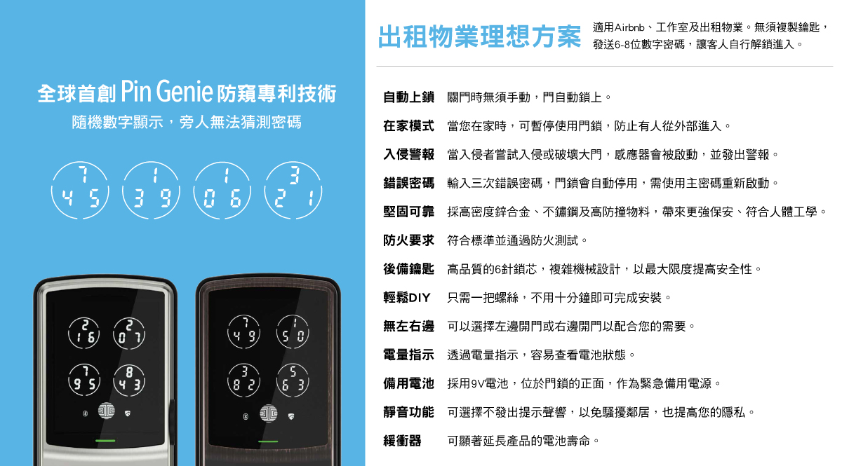 .防窺面板:Pin Genie專利面板,無法追溯密碼、指紋的痕跡。
