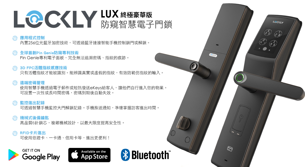 .3D FPC活體指紋感應技術:能辨識真實或虛假的活體指紋,有效防範仿指紋輸入。非一般光學感應可比。Lockly®系統程式可識別多達99個指紋,並能在0.5秒內快速開鎖。